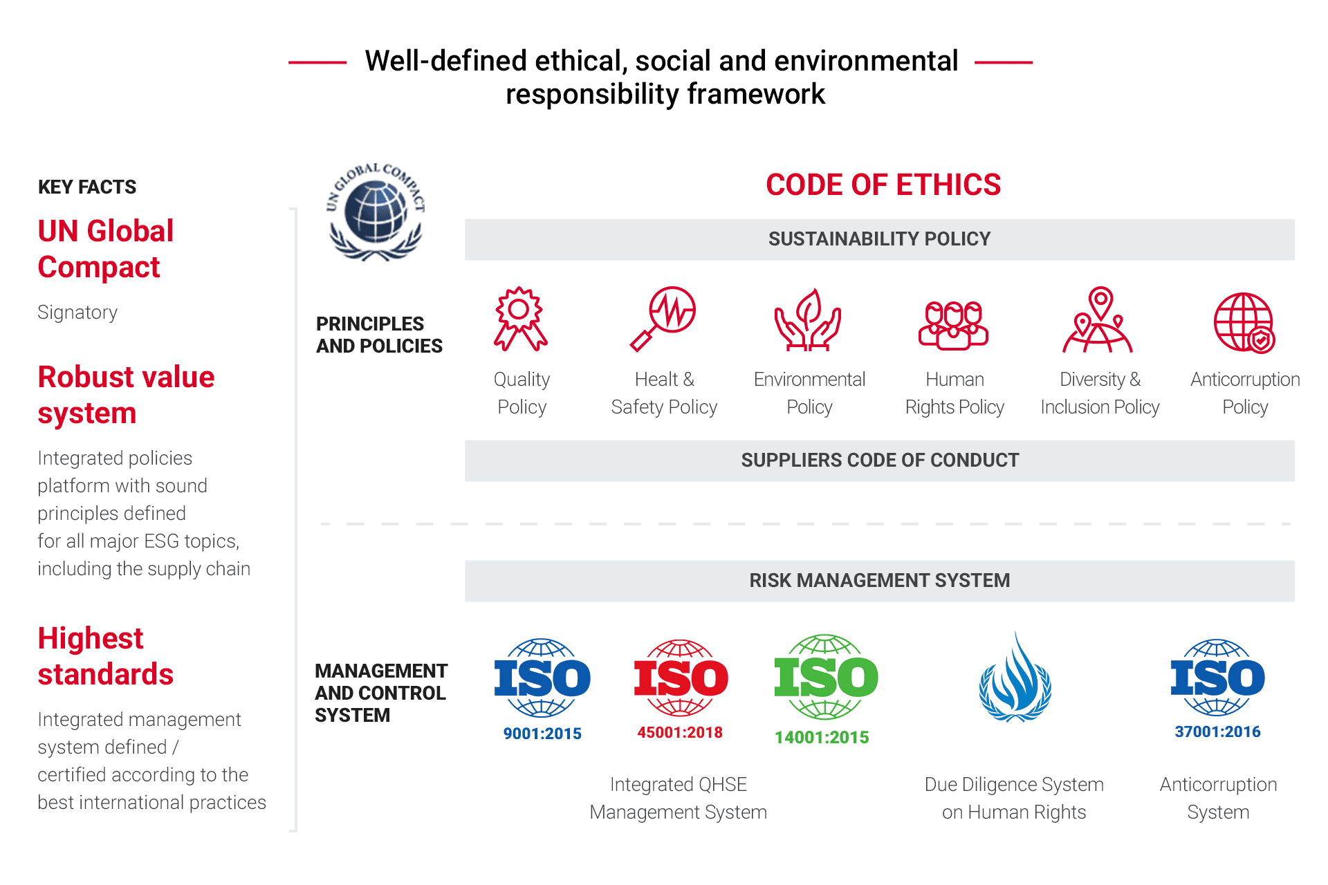 We adopt a corporate management and organization model based on a system of principles and management and control instruments aimed at safeguarding key sustainability matters, in line with applicable regulations that exist in the different countries where we work, and also with the main international standards and guidelines.