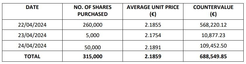 As part of this programme, a total of 5,568,369 ordinary treasury shares were purchased (equal to 1.16% of the total volume of shares traded in the aforementioned period) at an average price of €1.96 per share, worth a total of €10,914,911.21; - as part of the authorisation approved by the Shareholders today, the buy-back programme of treasury shares (the "Programme”) was launched.