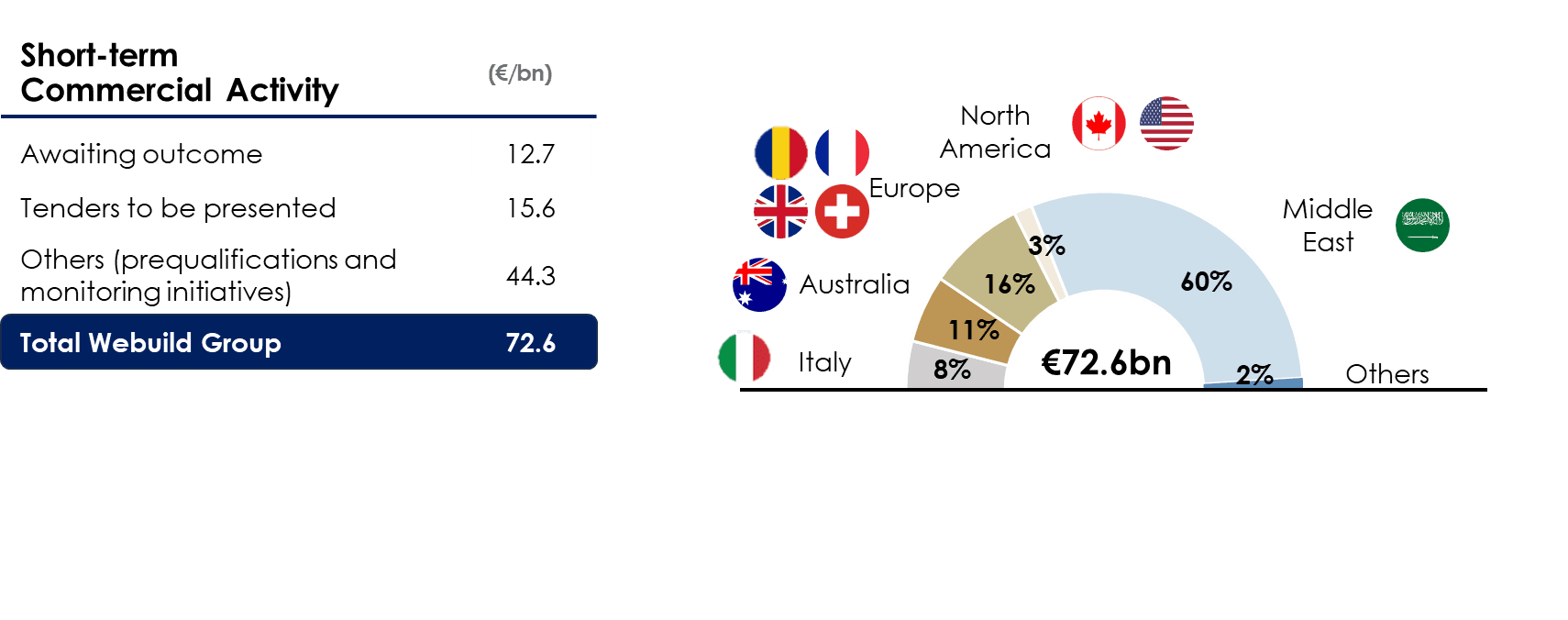 Webuild’s short-term commercial pipeline amounts to approximately €72.6 billion and includes tenders submitted and awaiting an outcome for approximately €12.7 billion.