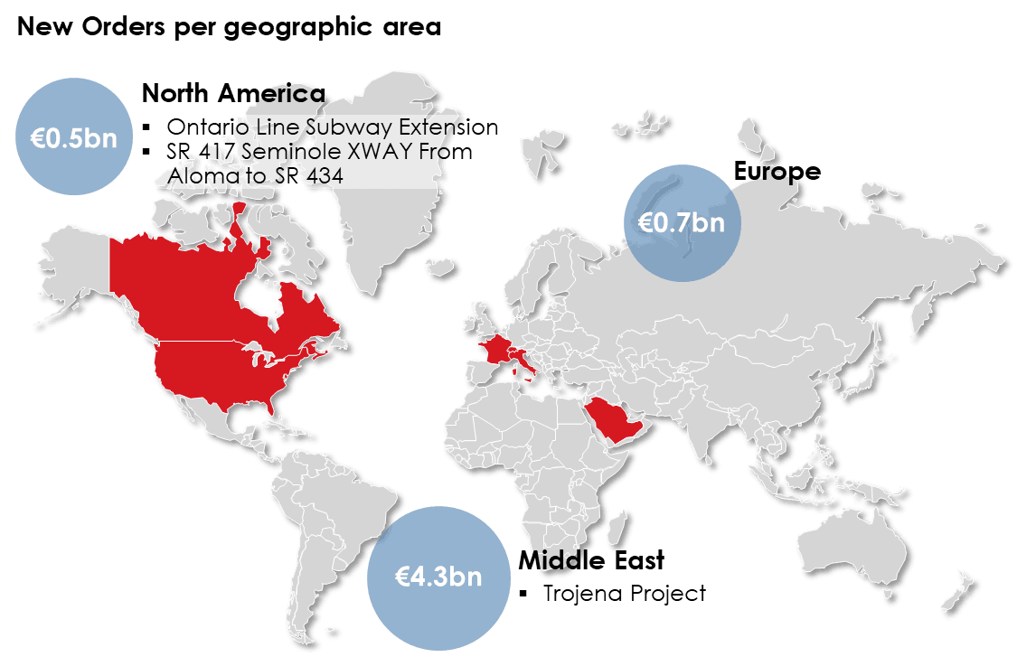Total new orders acquired and being finalised since the beginning of the year amount to €5.5 billion, including €0.7 billion worth of projects for which Webuild is the preferred bidder. Below is the geographical distribution of the new orders and the list of main contracts acquired: