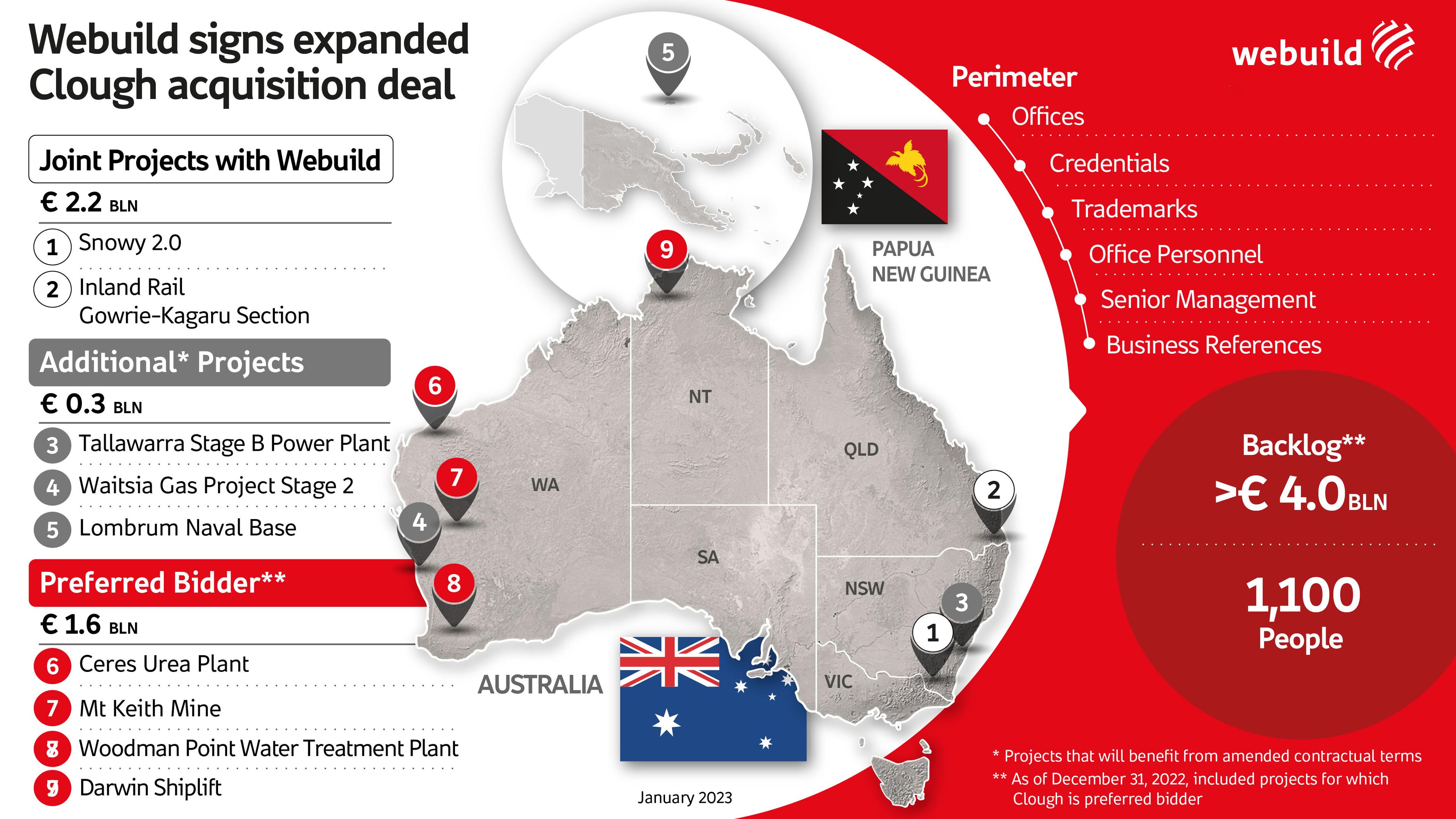 MILAN, February 3, 2023 - Webuild announces it has signed the contract with the Deloitte Administrators of Clough Limited (Clough) in Australia to acquire Clough assets. Following the disclosure on December 14, 2022 and January 19, 2023, the final acquisition perimeter comprises: i) Clough’s organisation, including offices, trademarks, credentials, business references, senior management and office personnel and, ii) more than €4 billion worth of projects in backlog (as of end 2022), including the related project workforce.