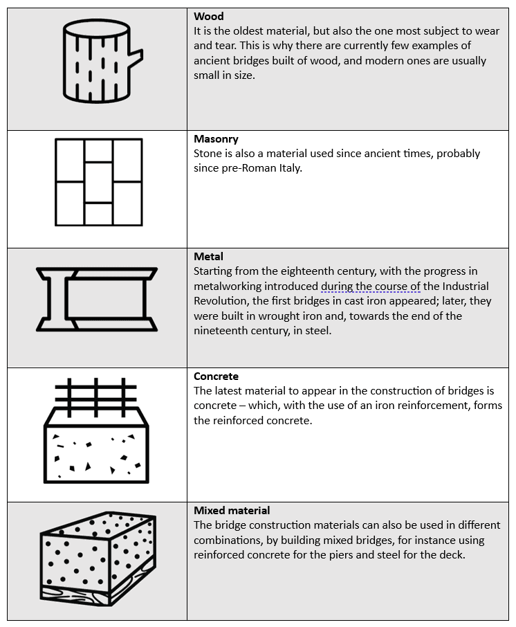 The bridges can be built with 4 types of materials, two ofthem very old – wood and stone; and two that have begun to spread since the Industrial Revolution – metals and concrete.