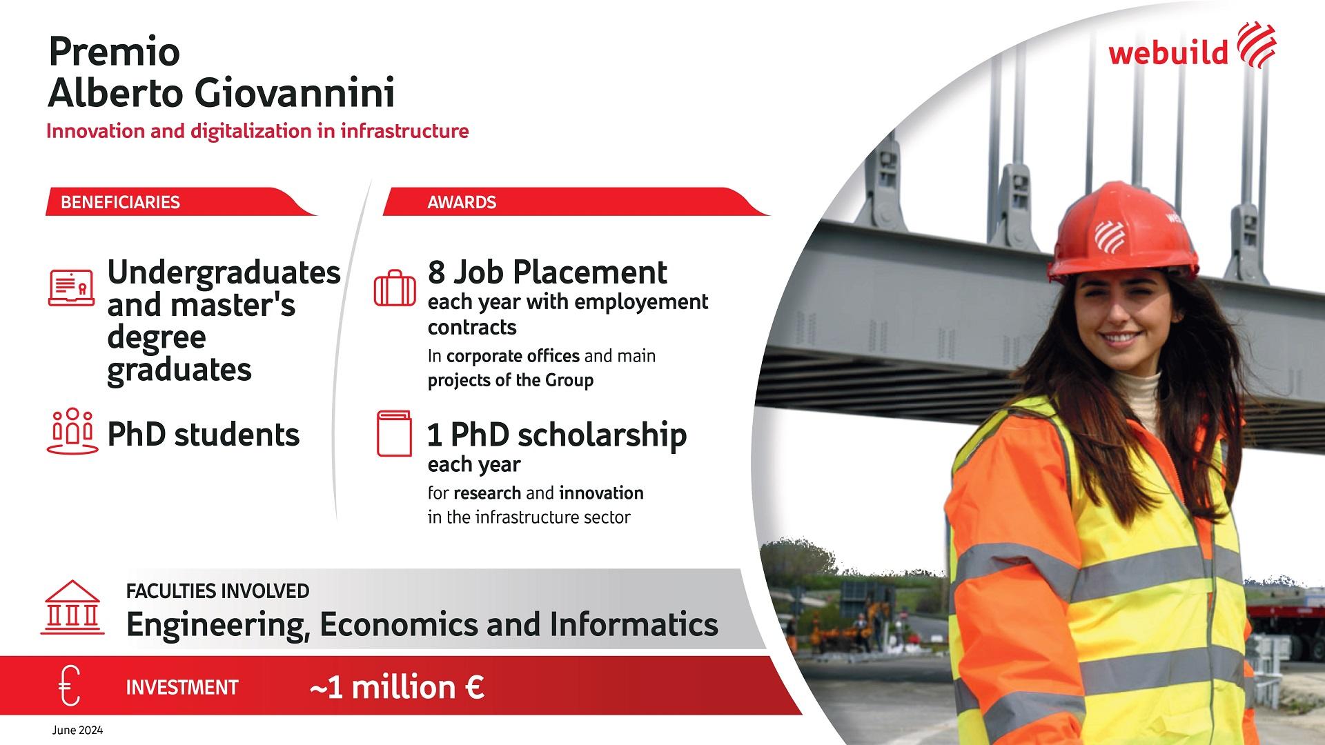 Webuild believes in newly formed young talents, planning the future by investing in their present, and their ideas. This is why the Group launched in the 2021 the "Premio Alberto Giovannini": a programme dedicated to young graduates and recent graduates, and to Italian universities, to promote innovation and research in infrastructure.