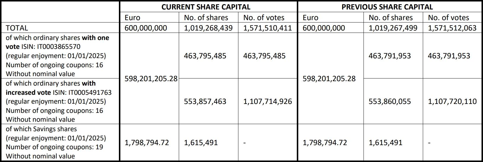 Indeed, following the issue sub (i), the share capital is still equal to 600,000,000 Euros, currently divided into 1,019,268,439 shares without express nominal value, of which 1,017,652,948 are ordinary shares and 1,615,491 are savings shares.