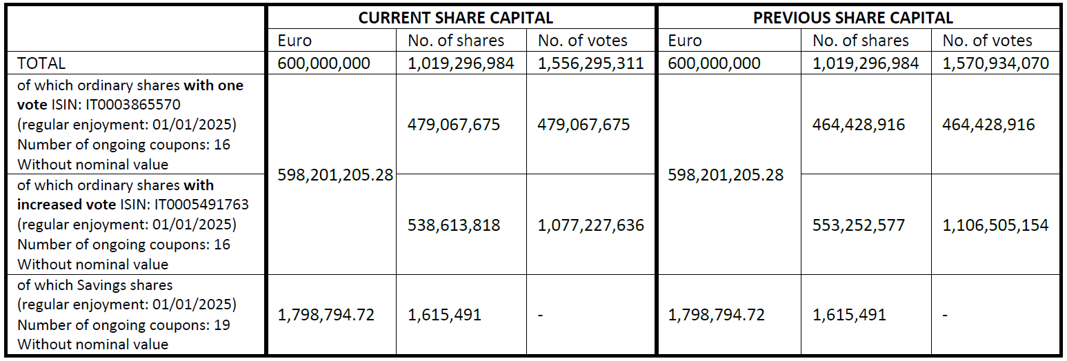 Milan, November 7, 2025 - Webuild S.p.A. is hereby publishing the data relating to the shares that make up the share capital and the number of voting rights exercisable at the meeting, following the cancellation of the increased voting rights relating to a total of 14,638,759 Webuild ordinary shares, that occurred in the month of October 2025.