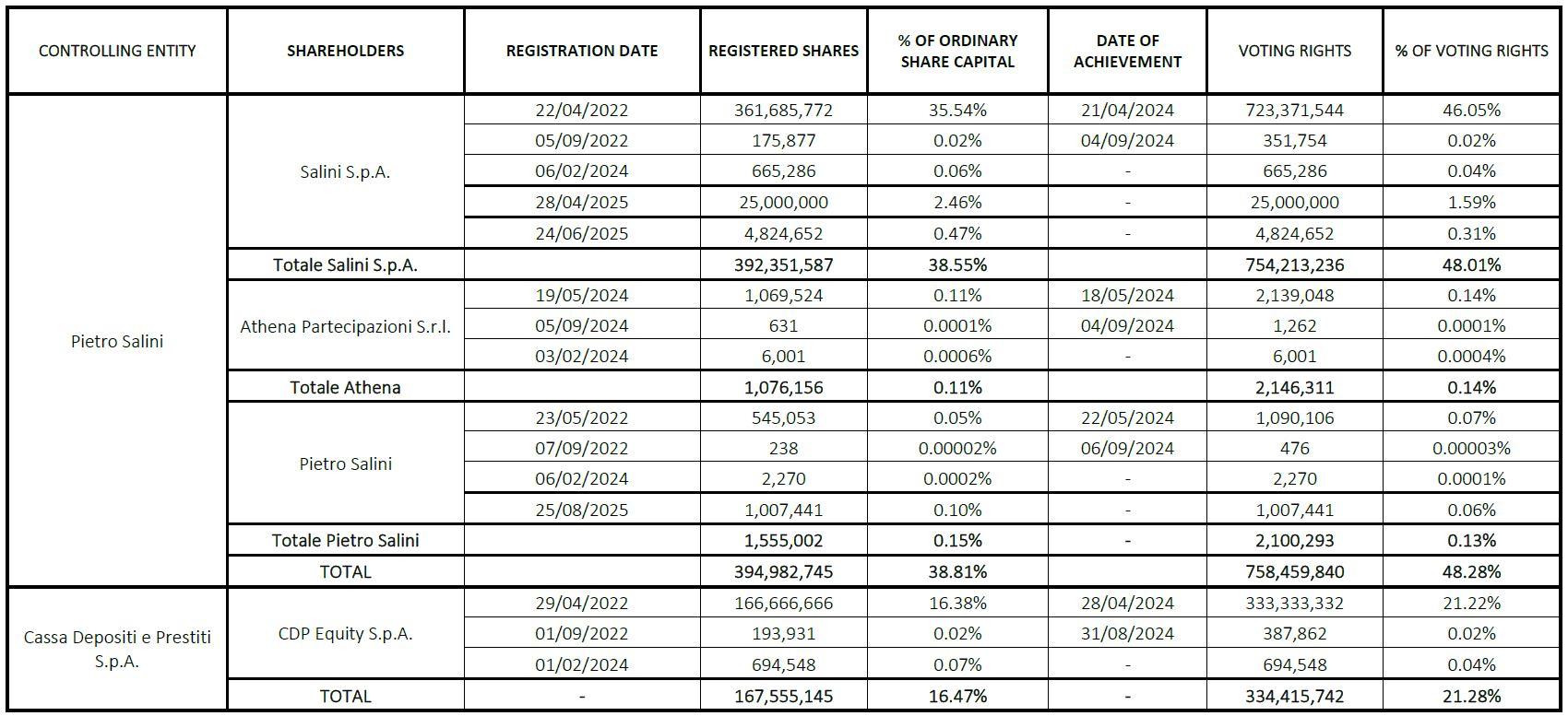 Milan – October 7, 2025 - Following the Press Release issued today on the change in share capital and the total amount of voting rights, please be advised that, given the small number of newly issued shares (n. 28,545 shares) and of shares cancelled from the increased vote (n. 604,886), and also taking into account the rounding made to the second decimal place, there have been no significant changes in the voting rights of Webuild S.p.A. shareholders holding more than 3% of the total voting rights and registered in the Register for increased voting rights compared to the previous Press Release of September 5, 2025. The table below reflects the above-mentioned changes.