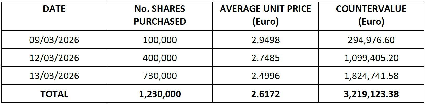 Below, attached, the details of the purchases made (through the intermediary Intermonte S.p.A.) and the operations carried out in the aforementioned period, in detail.