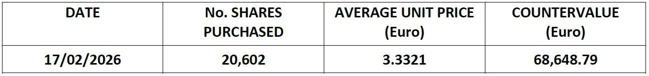 Milan, February 23, 2026 – Webuild informs that it has purchased, in the period February 16-20, 2026 included, no. 20,602 ordinary treasury shares (equal to 0.002% of the ordinary share capital and 0,21% of the total volume of the exchanged shares in the aforementioned period) for an overall countervalue of €68,648.79.