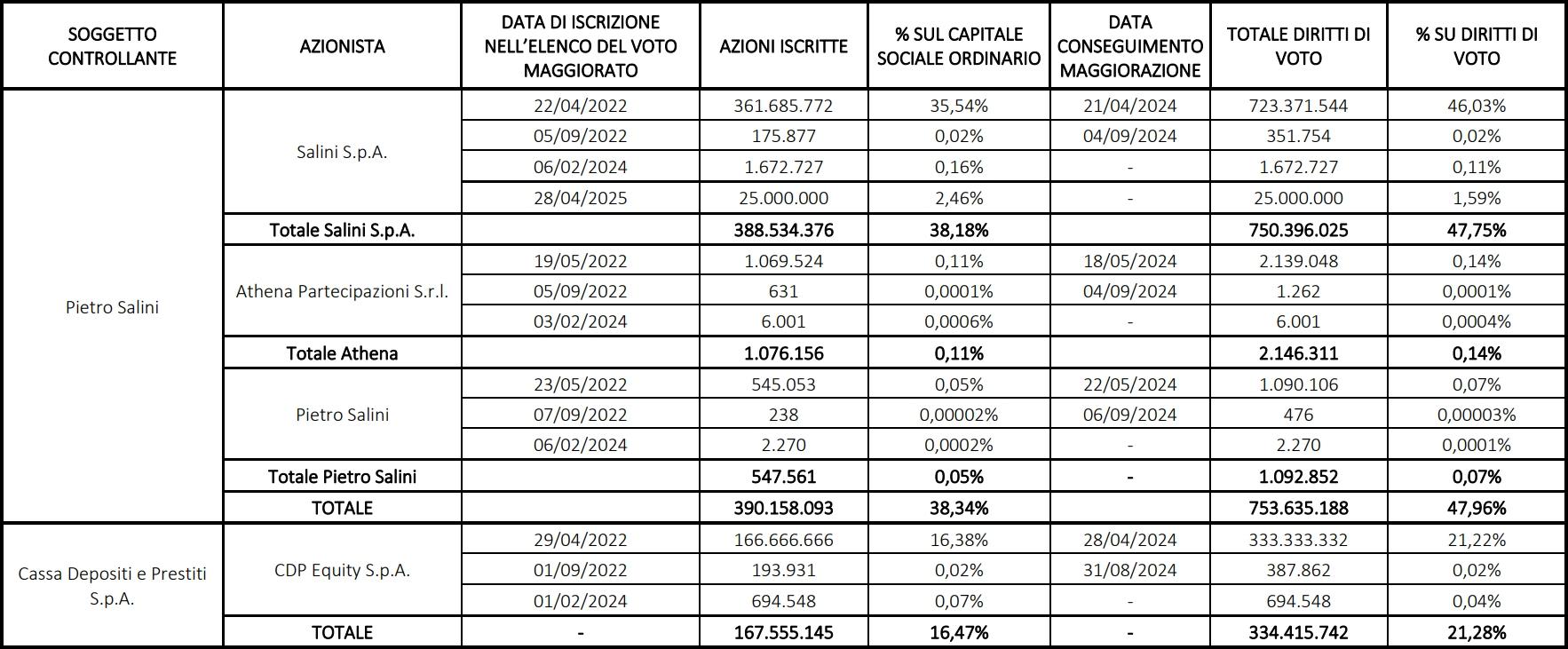 Milano, 5 giugno 2025 – Facendo seguito al Comunicato Stampa diffuso in data odierna sulla variazione del capitale sociale e dell’ammontare complessivo dei diritti di voto, si comunica che, considerata l’esiguità delle azioni di nuova emissione (n. 940 azioni) e delle azioni cancellate dal voto maggiorato (n. 2.592), non si registrano variazioni significative in relazione ai diritti di voto degli azionisti di Webuild S.p.A. titolari di una partecipazione superiore al 3% del numero totale dei diritti di voto e iscritti nell’Elenco per il conseguimento della maggiorazione del diritto di voto.La sottoindicata tabella non registra quindi variazioni rispetto al Comunicato Stampa del 6 maggio 2025.