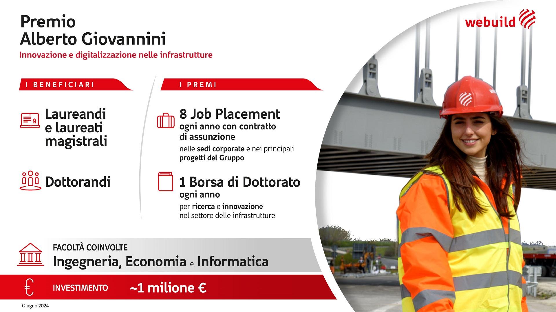 Webuild crede nei giovani talenti appena formatisi e progetta il futuro investendo nel loro presente e nelle loro idee. È per questo che il Gruppo ha lanciato nel 2021 il "Premio Alberto Giovannini": il programma dedicato ai giovani laureati e neolaureandi e alle università italiane per promuovere l'innovazione e la ricerca nelle infrastrutture.