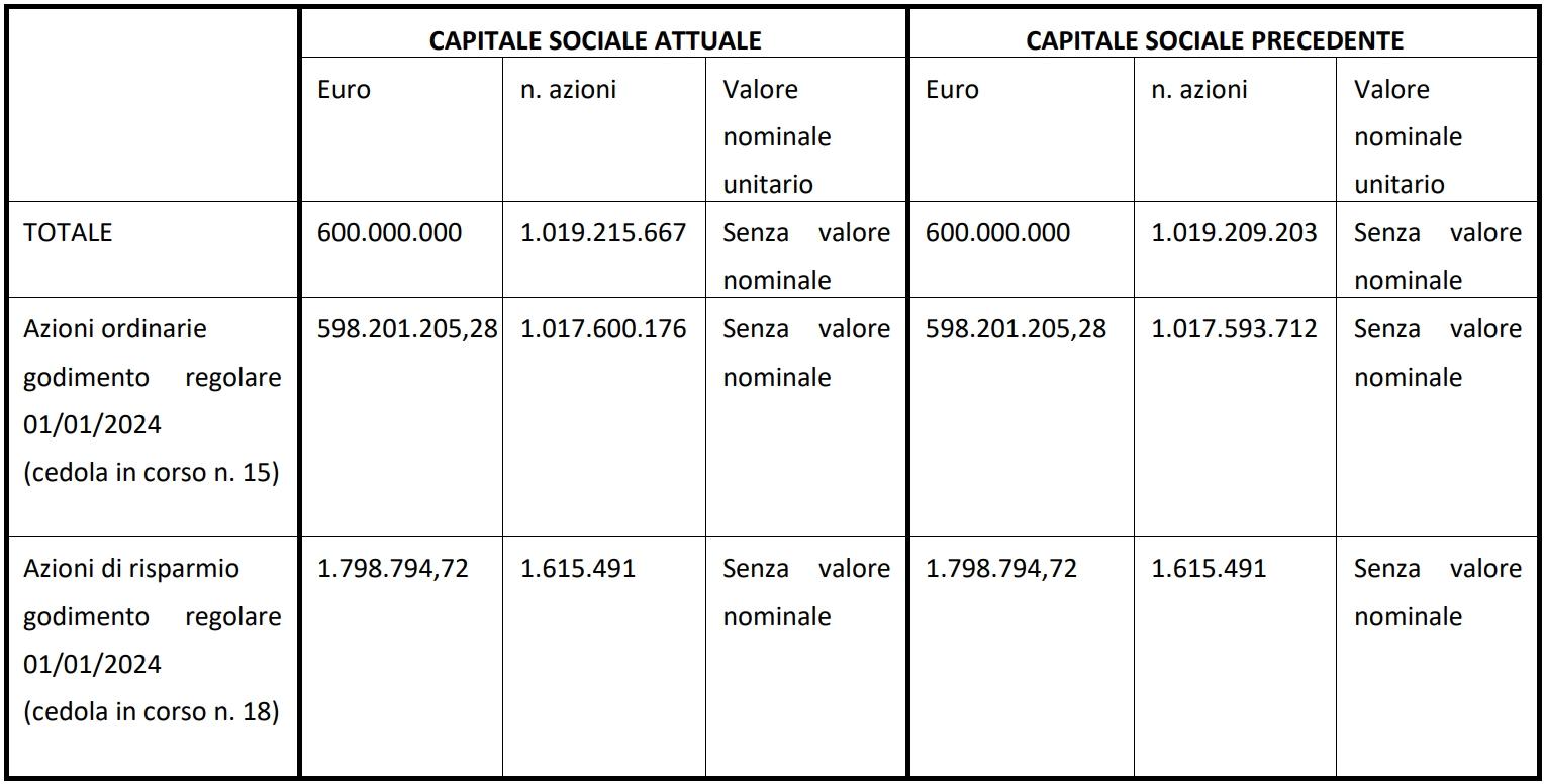 In seguito a tale emissione il capitale sociale risulta sempre pari a Euro 600.000.000,00, suddiviso attualmente in n. 1.019.215.667 azioni senza valore nominale espresso, delle quali n. 1.017.600.176 azioni ordinarie e n. 1.615.491 azioni di risparmio.