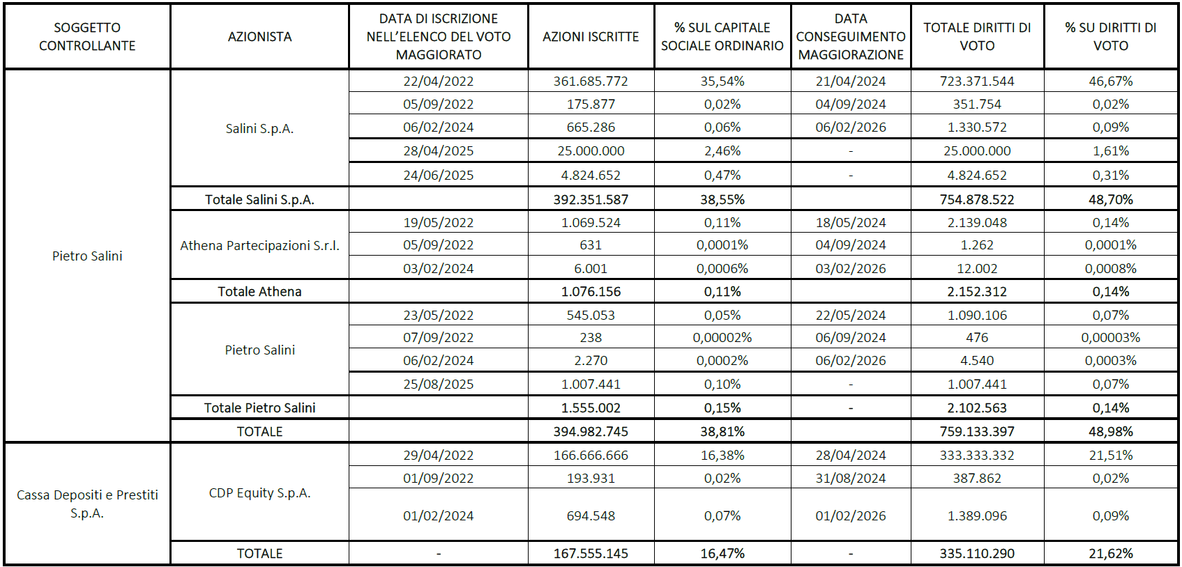Milano, 21 aprile 2026 – Facendo seguito al Comunicato Stampa diffuso in data odierna sulla variazione del capitale sociale e dell’ammontare complessivo dei diritti di voto, si comunica che, considerata l’esiguità delle azioni di nuova emissione (n. 1.327 azioni), non si registrano variazioni significative in relazione ai diritti di voto degli azionisti di Webuild S.p.A. titolari di una partecipazione superiore al 3% del numero totale dei diritti di voto e iscritti nell’Elenco per il conseguimento della maggiorazione del diritto di voto. La sottoindicata tabella non registra quindi variazioni rispetto al precedente Comunicato Stampa del 6 marzo 2026.