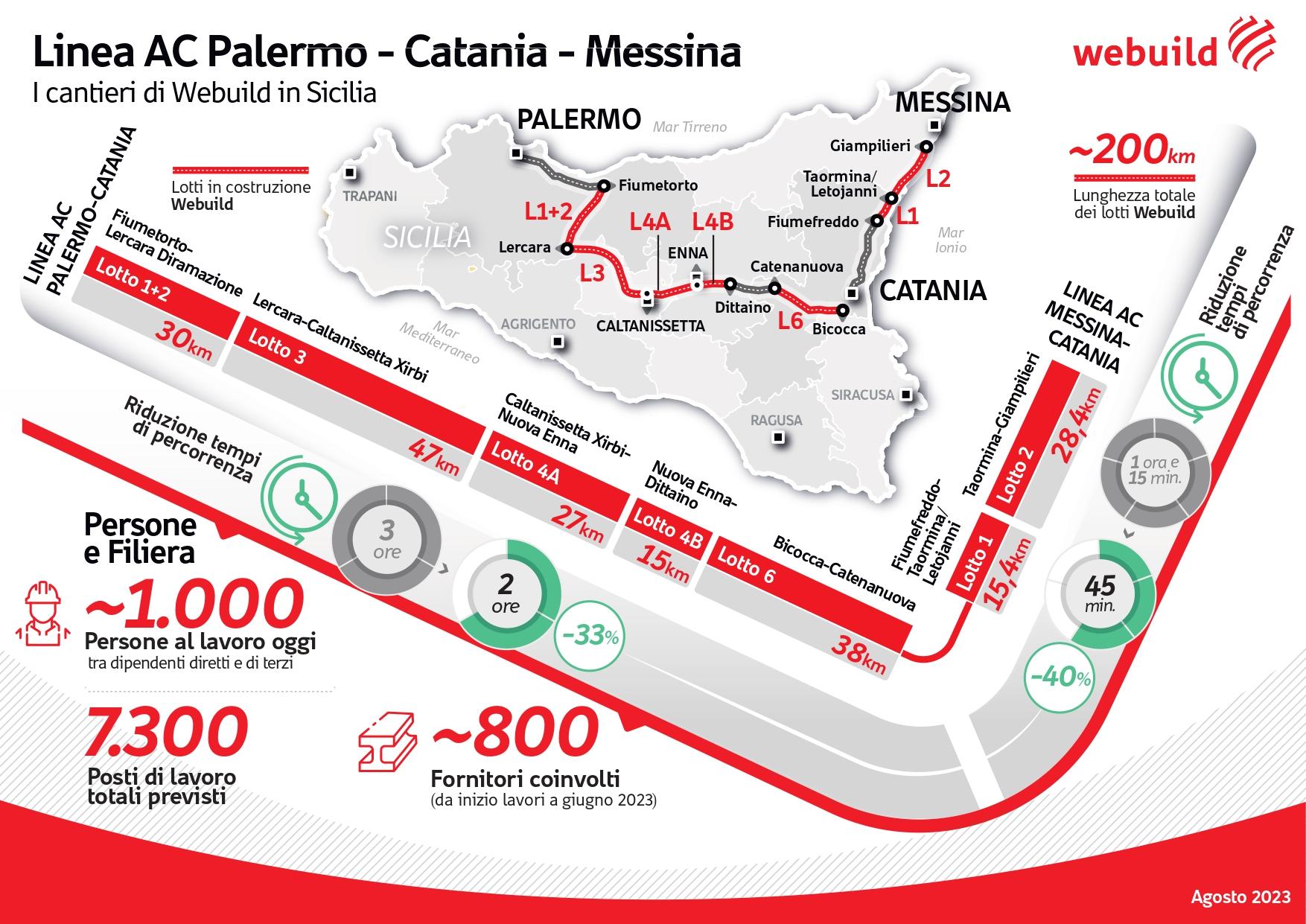 Sulla direttrice Palermo-Catania-Messina, Webuild è impegnato nella realizzazione di sette lotti, insieme ad altre imprese italiane: oltre al nuovo , sulla linea Palermo-Catania sta realizzando le tratte e , a cui si sono aggiunte più di recente la e la , mentre sulla linea Messina-Catania, sta realizzando i lotti e . Nel complesso, la costruzione di questi sette lotti si stima porterà alla creazione di 7.300 posti di lavoro, tra diretti e di terzi, con il coinvolgimento da inizio lavori ad oggi di circa 800 imprese.