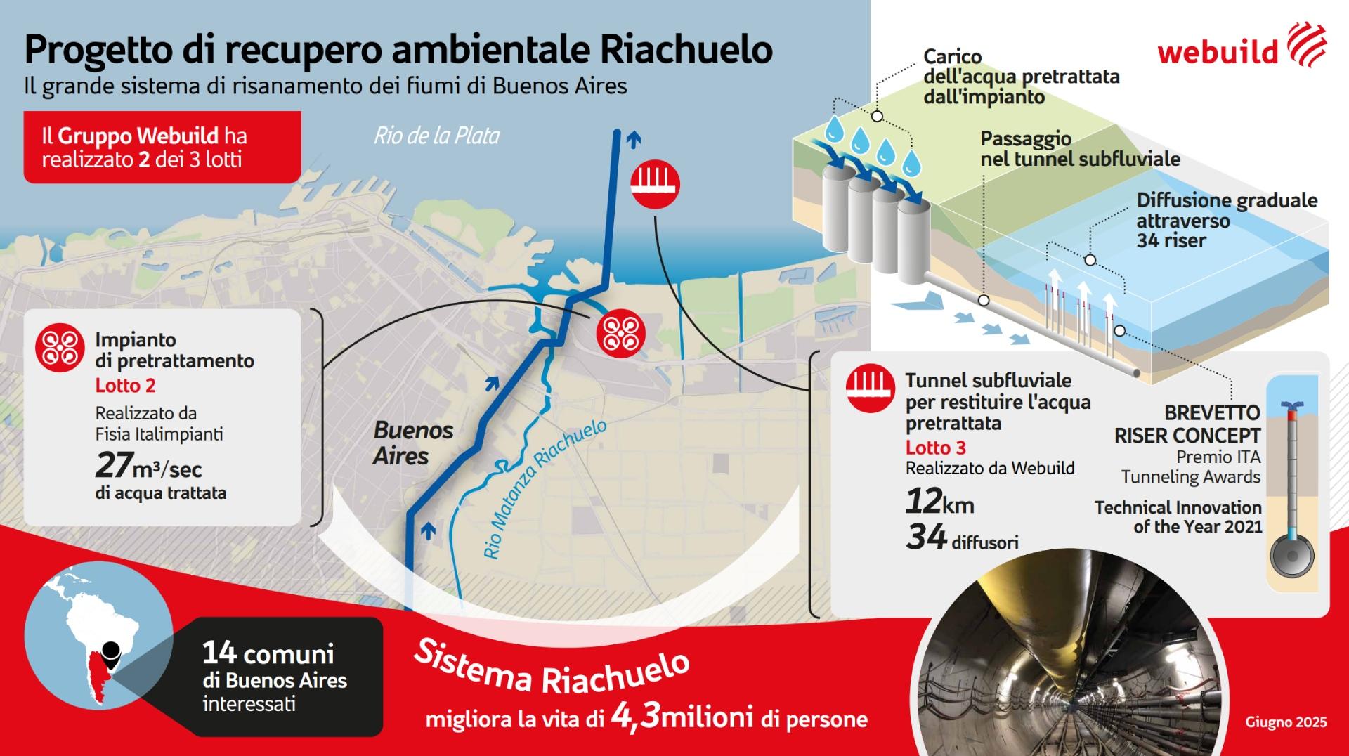 L’opera rappresenta il secondo dei tre lotti del sistema Riachuelo, che contribuirà a migliorare la grave situazione ambientale del bacino idrografico Matanza Riachuelo, garantendo flessibilità e sicurezza al sistema di depurazione delle acque di Buenos Aires con conseguenze dirette sulla salute e qualità della vita di circa 4,3 milioni di abitanti. Una volta completato, il sistema Riachuelo tratterà 2.332.800 m3 al giorno di acque reflue e, per la sua rilevanza ambientale e sociale, l’investimento complessivo di 1,2 miliardi di dollari prevede anche il finanziamento da parte della Banca Mondiale.