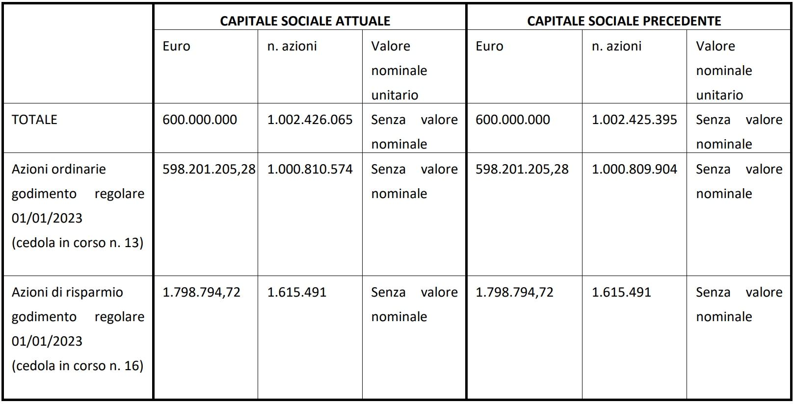 In seguito a tale emissione, infatti, il capitale sociale risulta sempre pari a Euro 600.000.000, suddiviso attualmente in n. 1.002.426.065 azioni senza valore nominale espresso, delle quali n. 1.000.810.574 azioni ordinarie e n. 1.615.491 azioni di risparmio.