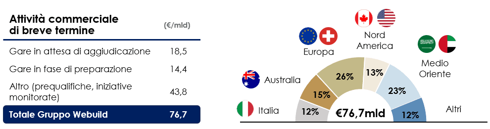 La pipeline commerciale di breve termine del Gruppo ammonta a €76,7 miliardi e include gare presentate e in attesa di aggiudicazione per €18,5 miliardi e gare in fase di preparazione per oltre €14 miliardi.